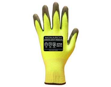"Monarch-PU" high visibility shell gray polyurethane palm coating ANSI cut level A3 contact heat level 1