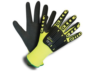 "Ogre-Impact" hi-vis polyester shell black sandy nitrile palm coating TPR protectors interior foam palm padding